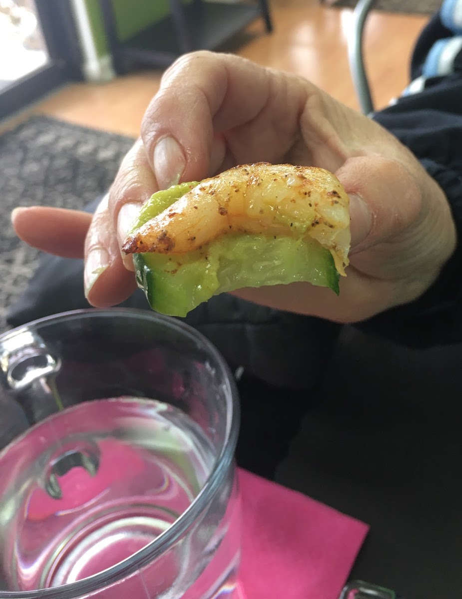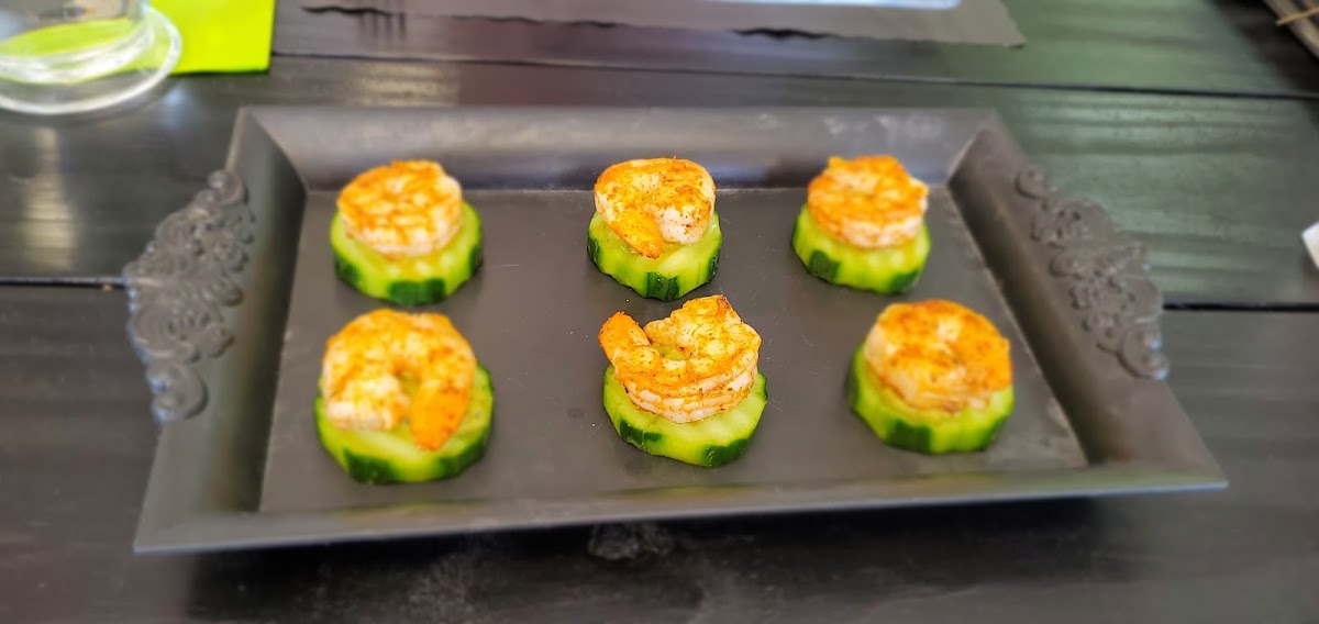 Blackened shrimp atop guacamole & English cucumber rounds.