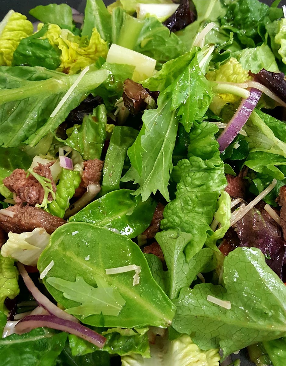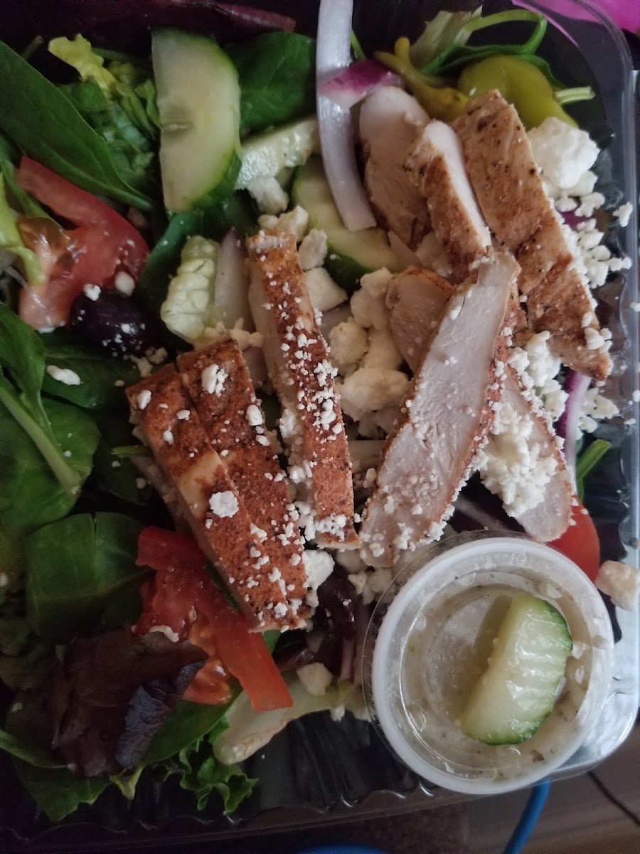 Greek seasoned and grilled 6 oz. chicken breast on a bed of crisp romaine lettuce with tomatoes, Kalamata olives, feta cheese & Greek vinaigrette.